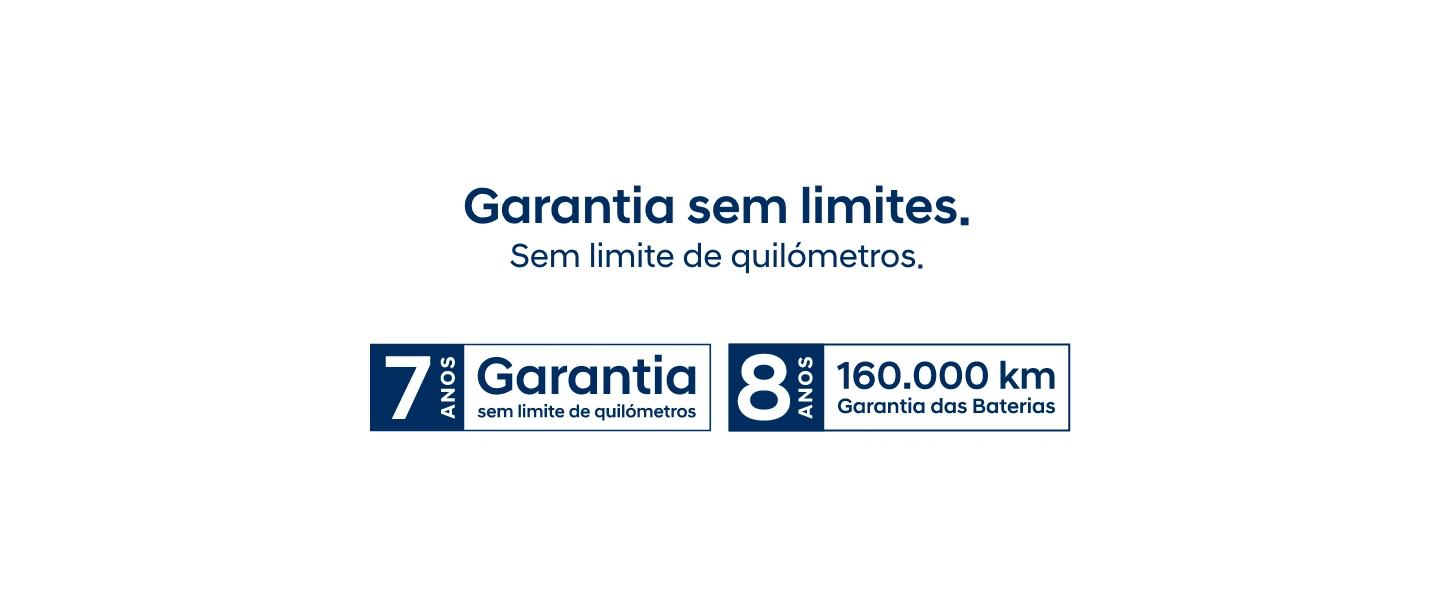 7 anos de garantia sem limite de quilómetros*. 8 anos ou 160.000 km de garantia da bateria de alta voltagem*.